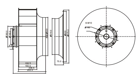 ②组成部件:高效外转子交流电机、后倾式圆弧形铝合金叶轮、免维护深沟球滚珠轴承、静电粉末喷塑转子